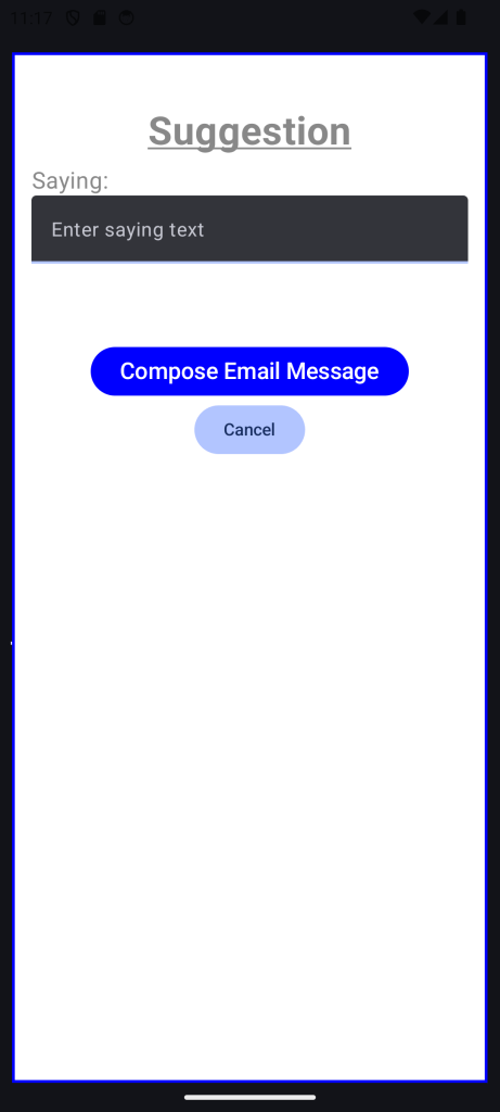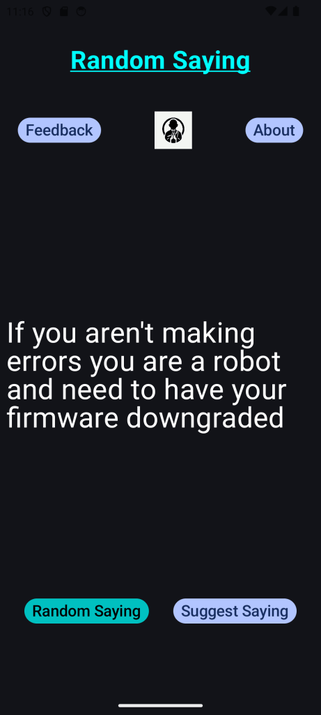 A random saying, proverb, or quote is displayed at startup, then a button is provided if you wish to display another. A button is also provided for you to send your favorite saying, proverb, or quote to 29Apps for possible inclusion in a future release.