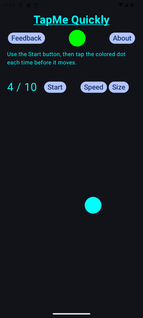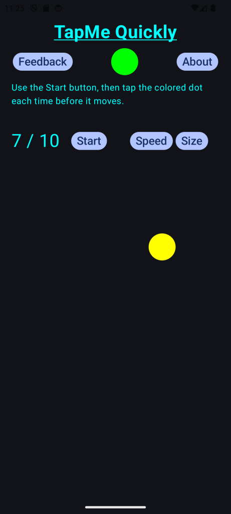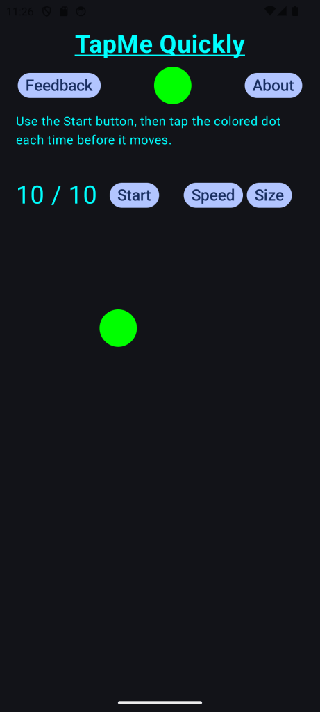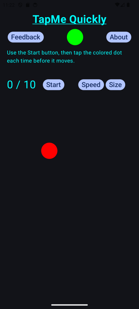 Test your eye-hand coordination by tapping the colored circle quickly before it moves. A successful tap changes the circle’s color and plays a tap sound. Time between moves and size of the circle can be adjusted by the user in the Settings. Start with a large and slow circle to work on coordination. As your speed improves you can progress the size and speed towards small and fast.