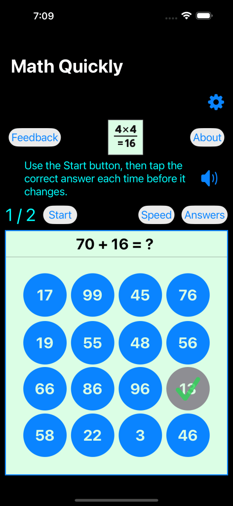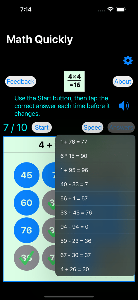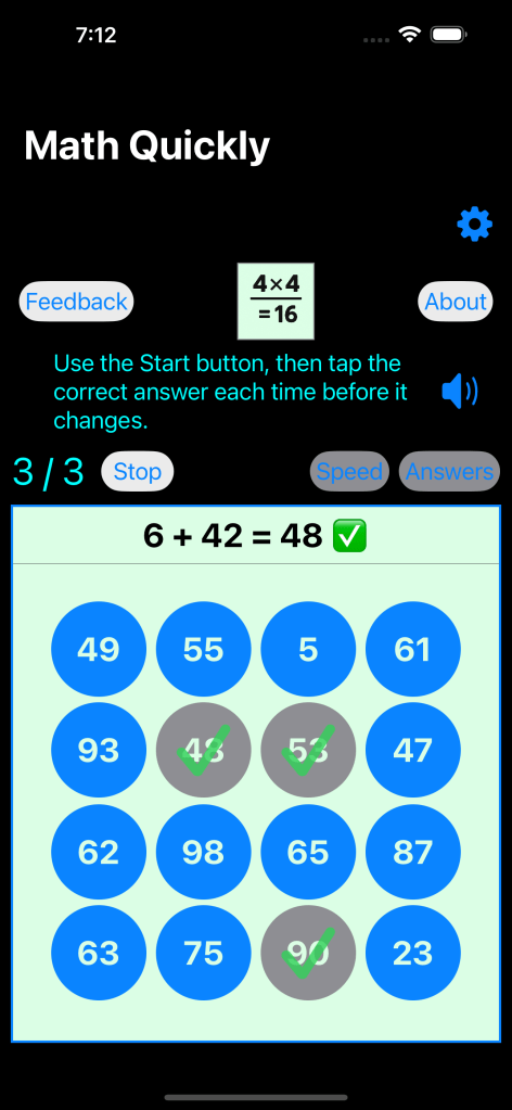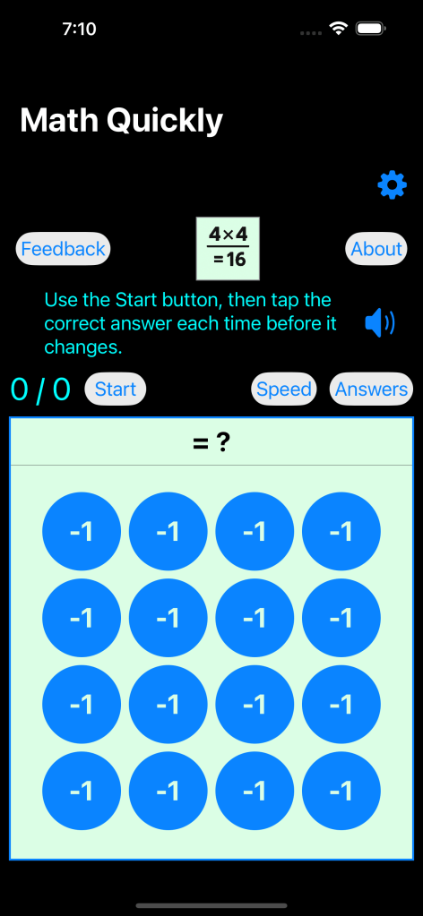 Simple math problems where you must tap the correct answer before time expires 10 times in a row.