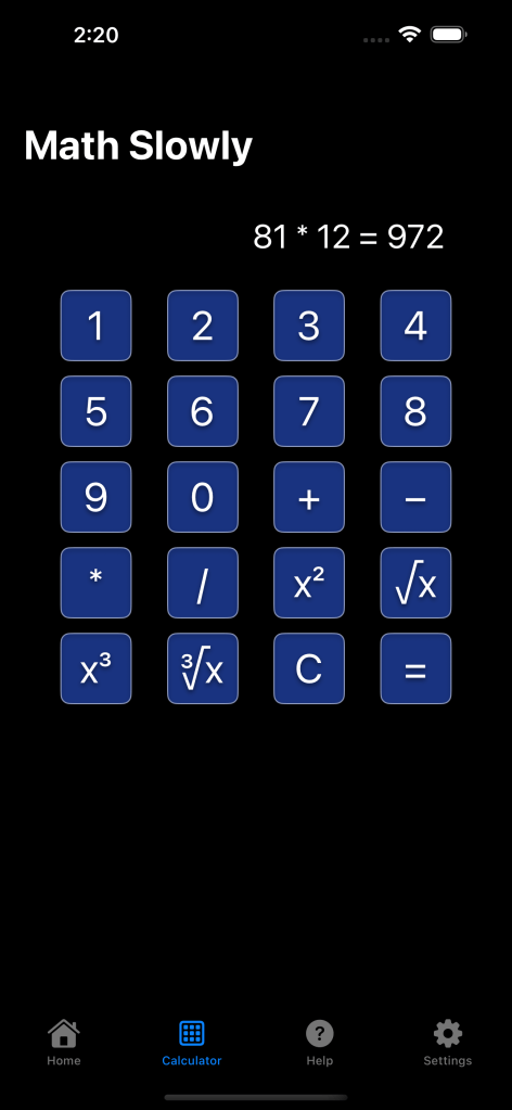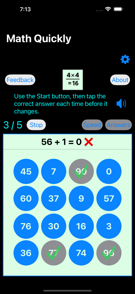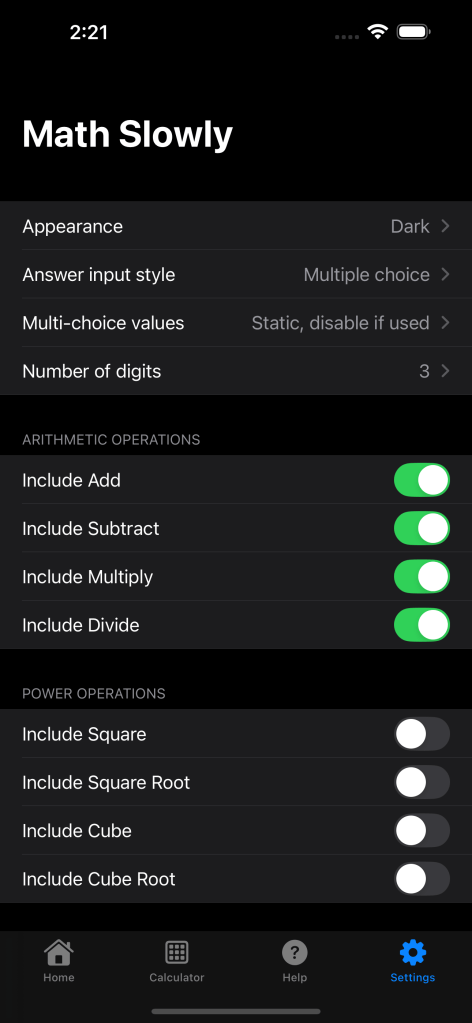 Math operations supported are add, subtract, multiply, divide, square, square root, cube, and cube root. Each math operation can be individually included or excluded in the Settings. Also in the Settings you can select whether you prefer to work with 1, 2, 3, or 4 digit math.