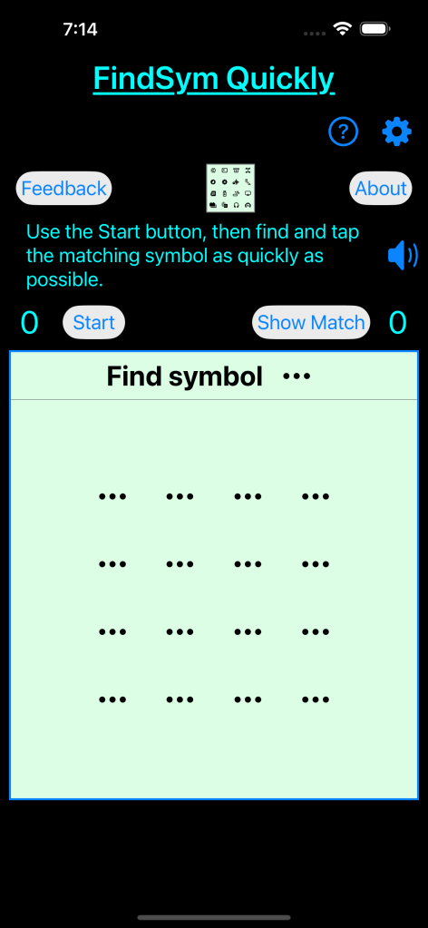 A random selection of 16 symbols is presented, one of those is randomly selected to be found. See how quickly you can find the matching symbol, then a whole new set is presented.