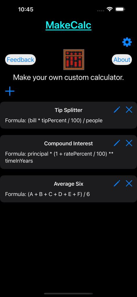 Make your own custom calculator. Enter your own formula, for example calculating tip splitter, compound interest, dosage calculator, ROI estimator, or any formula such as y = ax + b. Your calculator can then be named and saved for future use.