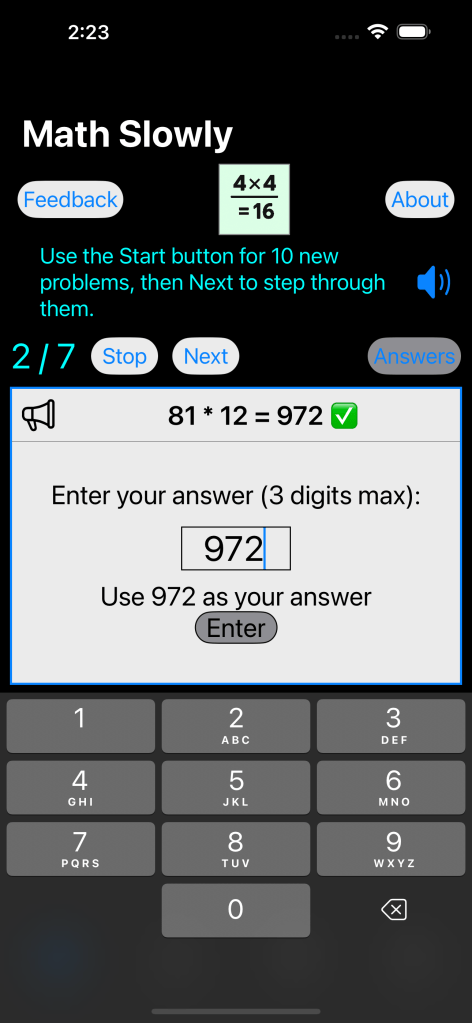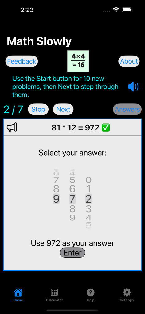 Simple math problems where you enter the correct answer for each of a set of 10 problems. No time limit, you work at your own speed. Several answer entry modes are support including typing with the keyboard, using scroll wheel style entry, and multiple choice. Try to use your brain (like it is an app), but a calculator is built-in if you get stuck or just want some help.