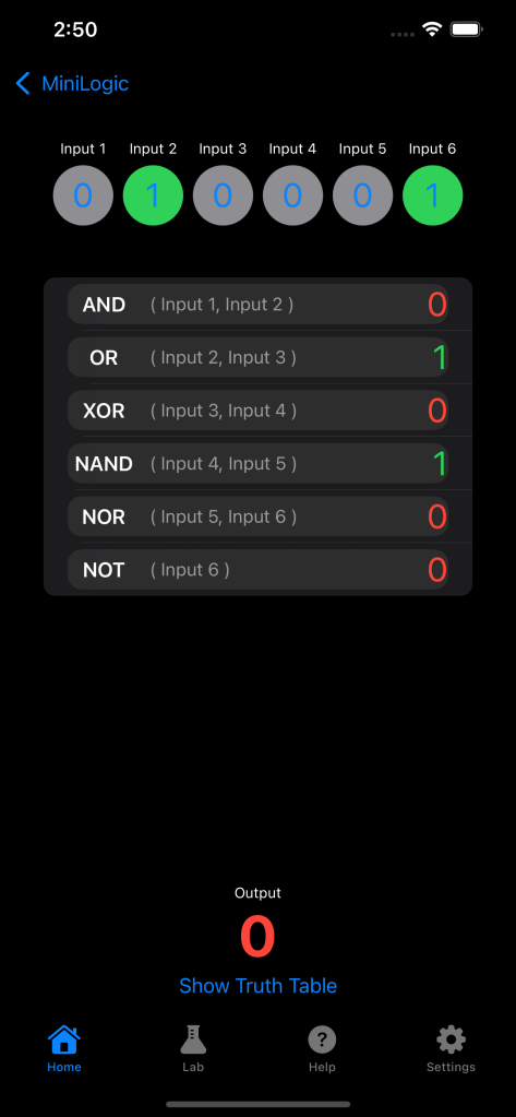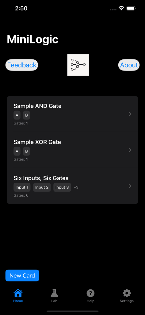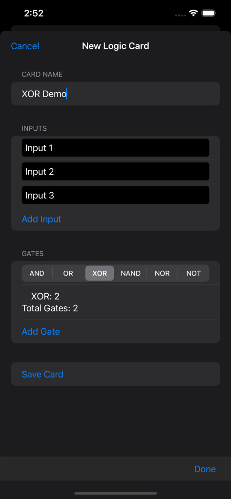 Fun with logic gates. Learn and play with the 6 basic logic gate types AND, OR, XOR, NAND, NOR, and NOT. Make a card with one or more gates, adjust their inputs, and see the resulting outputs. A simple educational experience.