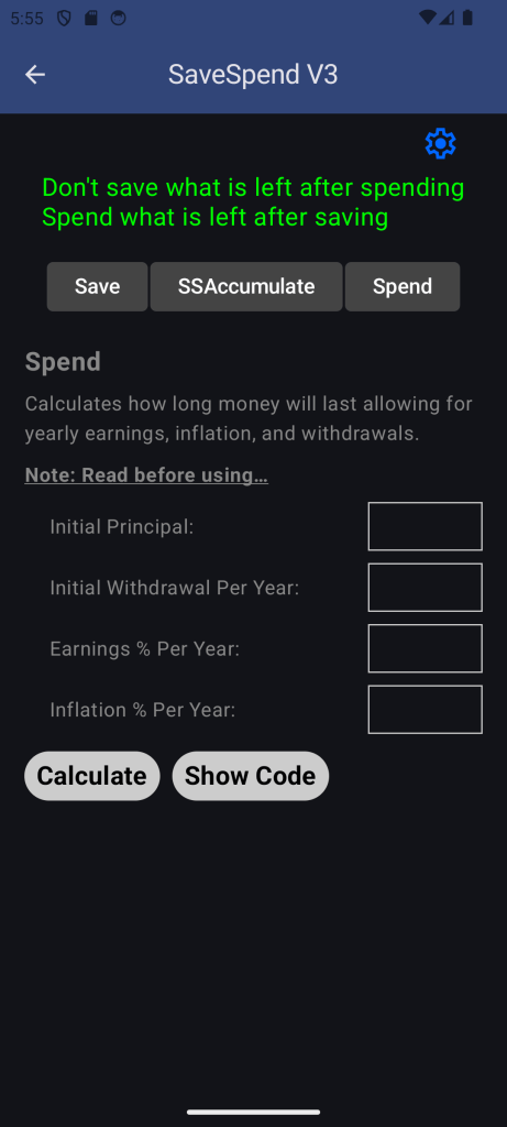 Spend will calculate the remaining balance year after year given an initial principal amount and initial withdrawal amount per year. You can budget how long your money will last given its earnings rate per year and the inflation rate per year.