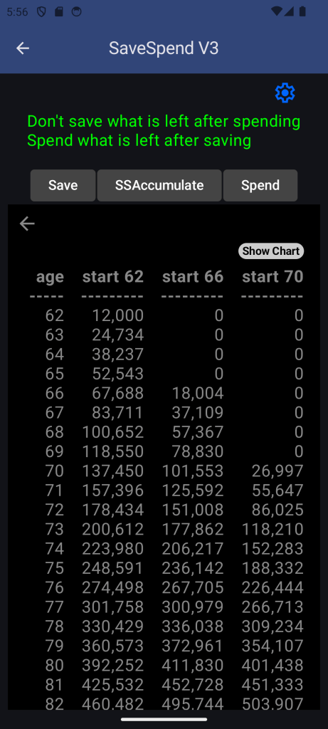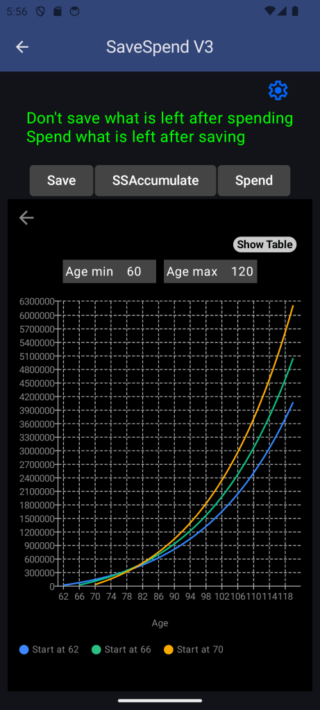 Helpful to plan and budget your money, SaveSpend3 calculates Savings, or Social Security Accumulation vs filing age, or Spending over time. Interest, earnings, inflation, and taxes are included in the calculations as appropriate. Results can be viewed in a table or as a chart.