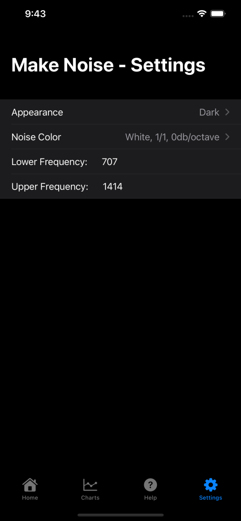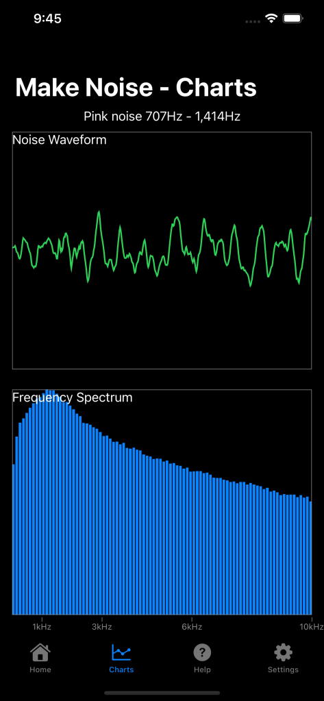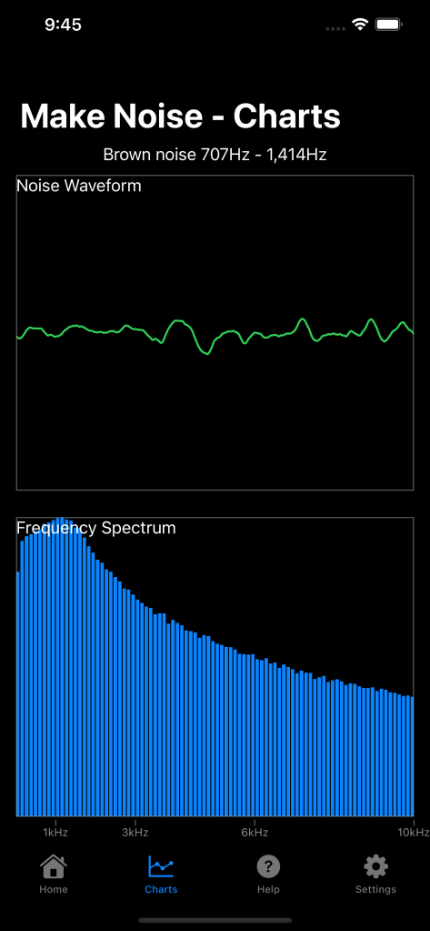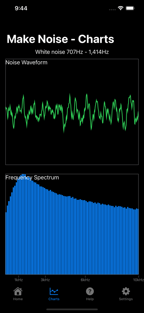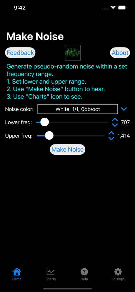 Generate pseudo-random noise. Useful for masking background sounds, improve focus and concentration, aiding sleep, tinnitus, anxiety, and more. You can personalize noise type white or pink or brown, as well as a frequency filter for your own best results. In addition to audio there is a Charts view to see the actual Noise Waveform and Frequency Spectrum.